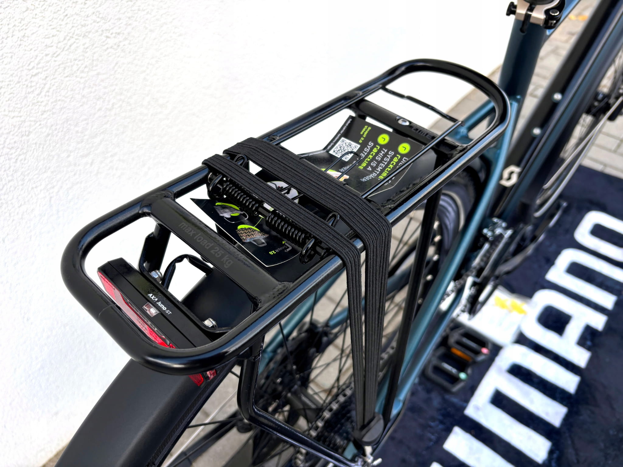 - Dodatki: Bagażnik Racktime z zaciskiem spreżynowym / SnapIt 2.0 / Szerokie profilowane błotniki Curana / podpórka Ursus Mooi