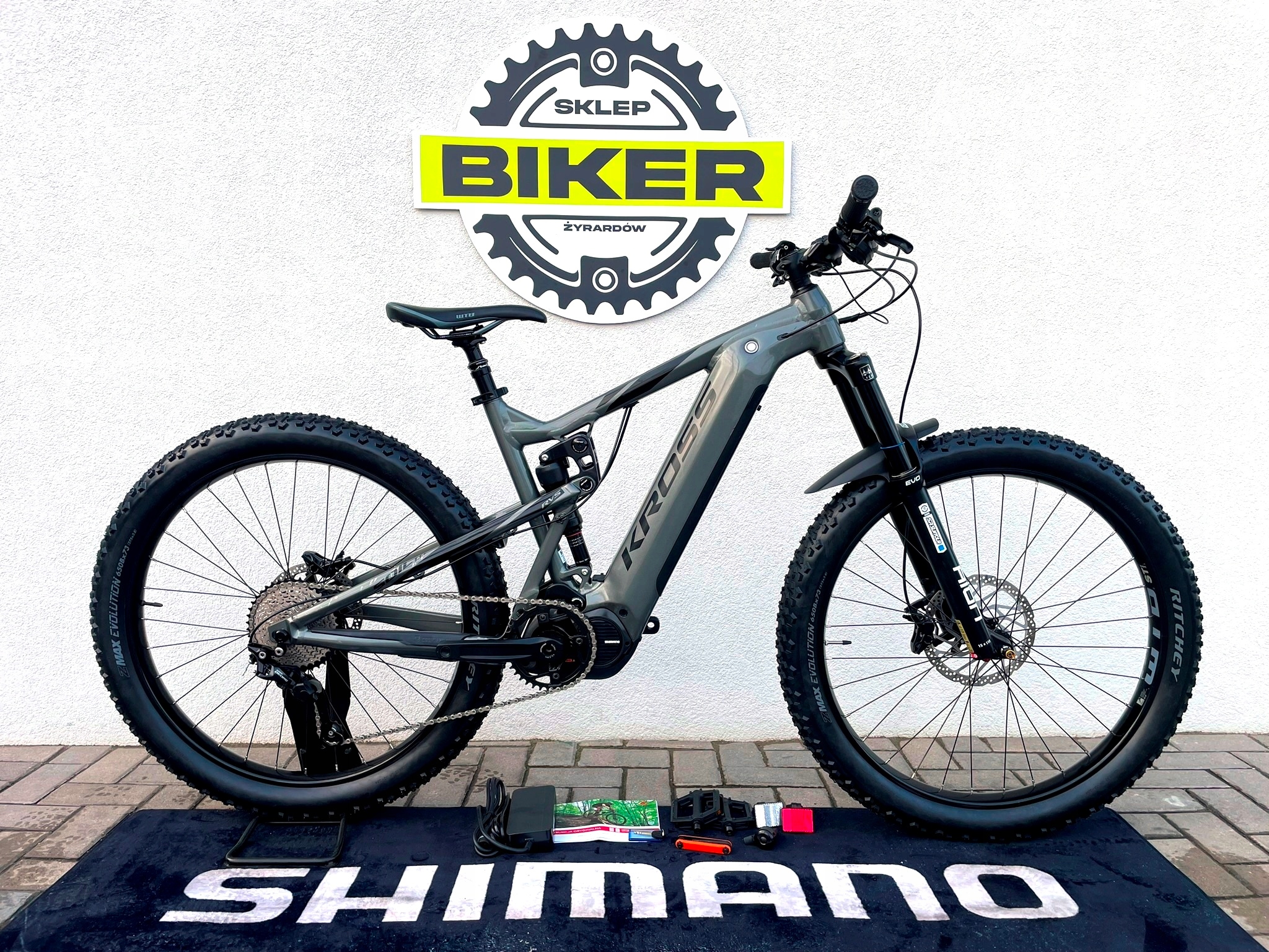 W zestawie dokumenty, pedały, ładowarka, kluczyk do baterii, akcesoria.