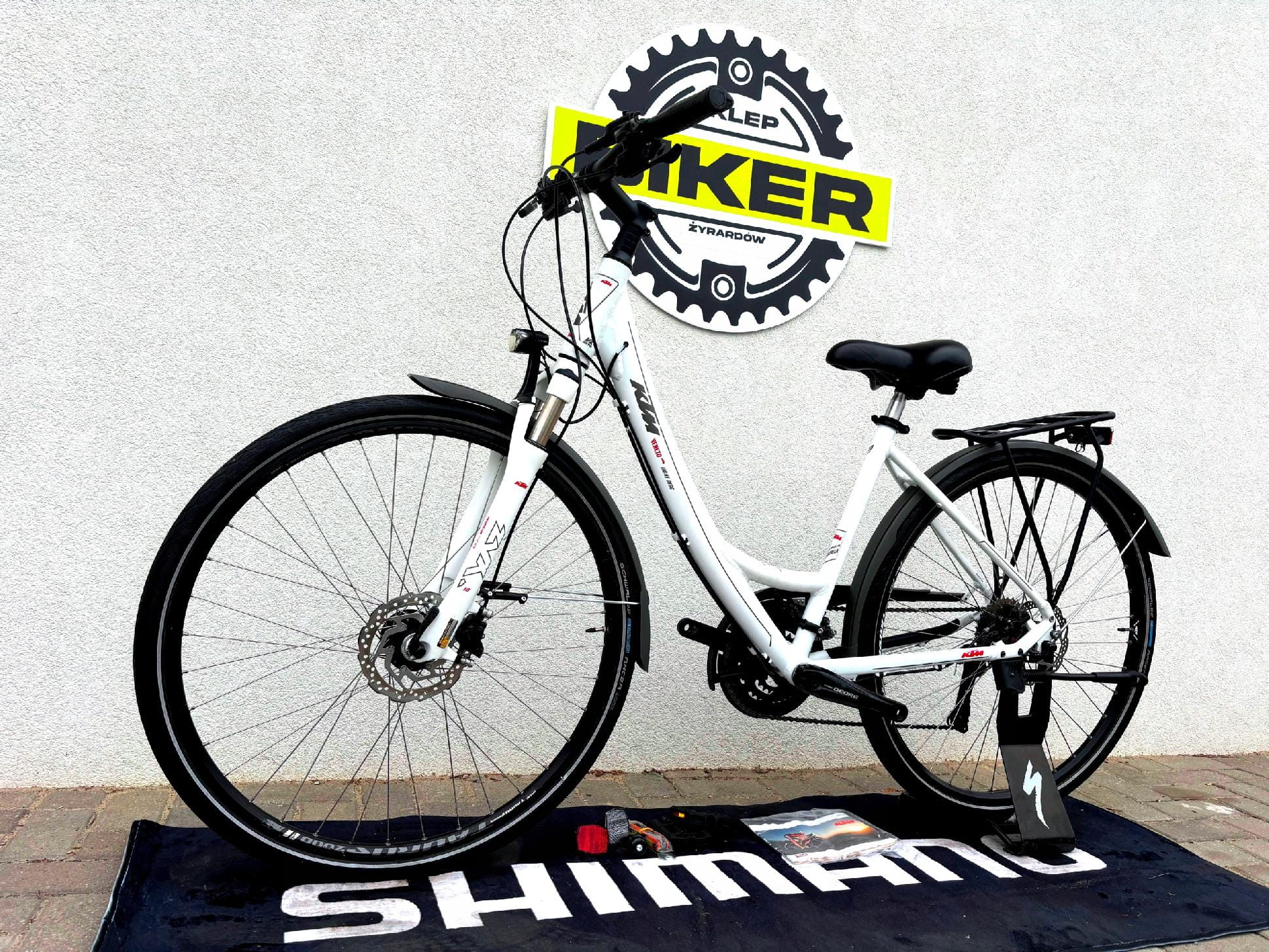 - Bogate wyposażenie: oświetlenie, błotniki, bagażnik, podpórka