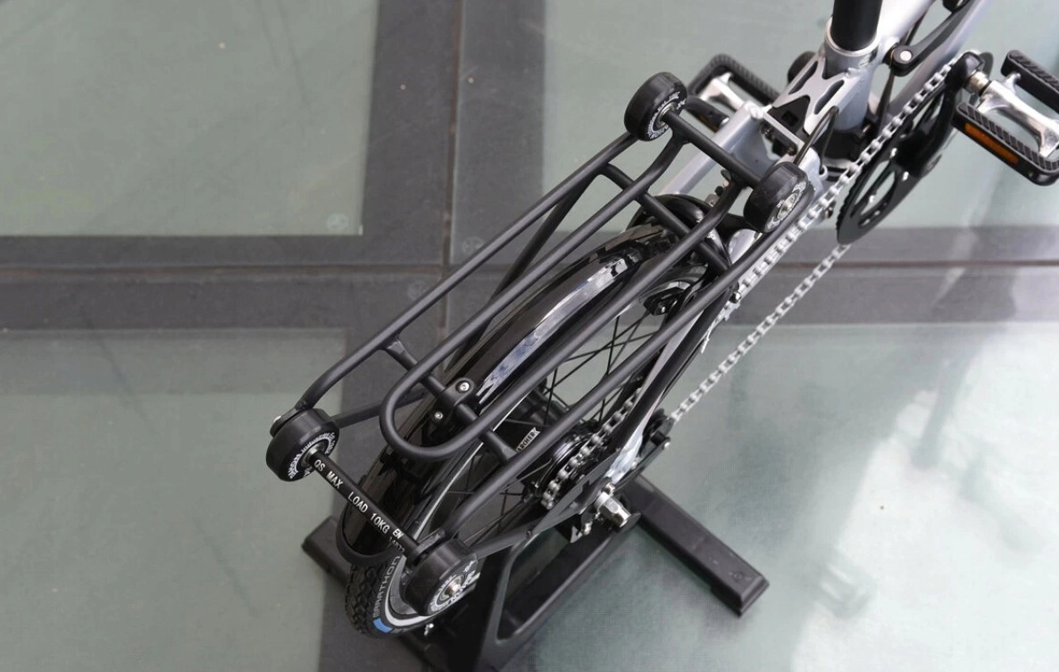 - Bagażnik z rolkami – umożliwia wygodne przesuwanie złożonego roweru jak walizki.